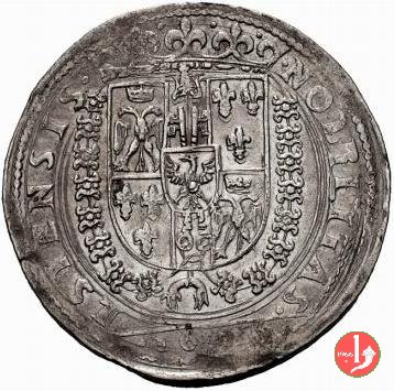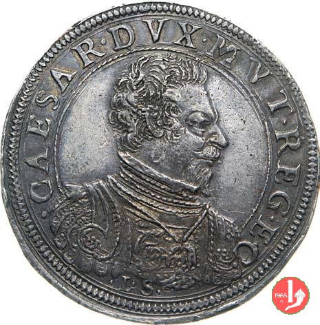 Tallero per il Levante Dritto: CAESAR • DVX • MVT • REG • E • C Mezza figura del Duca, rivolto a destra, coronato, corazzato e con scettro nella destra. In esergo • data • In cartella coronata, accartocciata e ornata sopra e sotto con un giglio, stemma interzato in palo (1° spaccato: 1 aquila bicipite coronata, 2 i tre gigli disposti 2 e 1; 2° chiavi decussate e legate, sormontate da tiara con al centro scudetto con l'aquila estense; 3° spaccato: 1 i tre gigli, 2 aquila bicipite coronata). | |