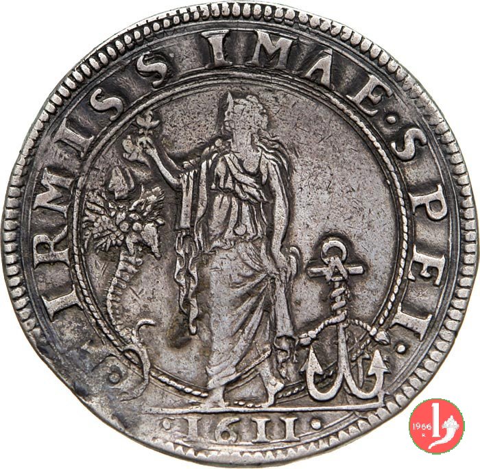 sotto il busto Donna paludata, appoggiata a destra ad una clava capovolta, con la testa rivolta a sinistra e con mazzo di fiori nella sinistra. In esergo • 1608 • | |