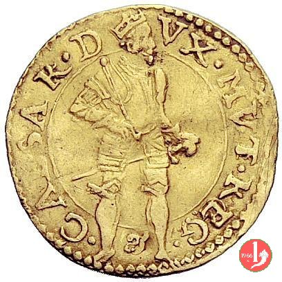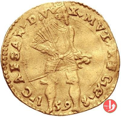 Ongaro Dritto: • CAESAR • DV X • MVT • REG • E • C • Il Duca coronato e corazzato, incedente a destra, tiene nella destra lo scettro