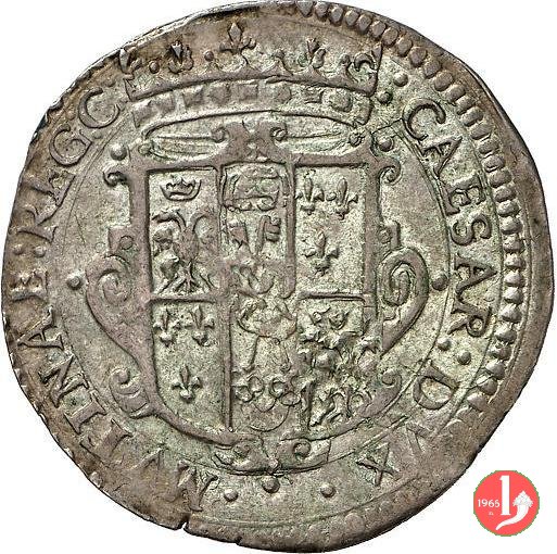 Scudo 1613 Dritto: • CAESAR • DVX • MVT • REG • E • C • Busto del Duca rivolto a sinistra. In esergo • L • S • Stemma coronato, circondato dal collare del Toson d'oro e interzato in palo(1° spaccato: 1 aquila bicipite coronata, 2 i tre gigli disposti 2 e 1 ; 2° chiavi decussate sormontate da mitria e caricate di scudetto con l'aquila estense; 3° spaccato: 1 i tre gigli, 2 aquila bicipite coronata. In Esergo • 1613 • | |