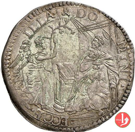 Giulio da 8 soldi Dritto: : CAESAR Stemma estense, in cartella coronata e ornata di volute. L'Annunciazione di Maria Vergine. | |
