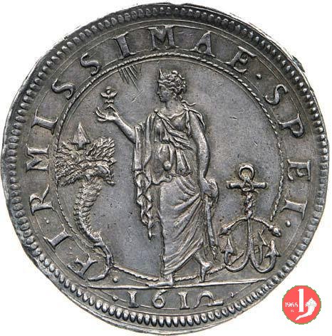 Doppio Ducatone 1612 Dritto: • CAESAR • DVX • MVT • REG • E • C • Busto a destra, corazzato e col collare del Toson d'oro; sotto • L • S • L'Abbondanza, incedente a sinistra, tiene nella destra protesa un fiore e con la sinistra sorregge la veste; davanti ad essa una cornucopia; dietro un'ancora; dall'alto, a sinistra, raggi. In esergo • 1612 • | |