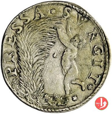 Grossetto con fanciullo Dritto: CAESAR Testa del duca a sinistra. Fanciullo nudo, a sinistra, con la testa rivolta indietro verso un raggio di luce che viene dall'alto,tiene con ambe le mani la città e il piede destro sopra un'ara. | |