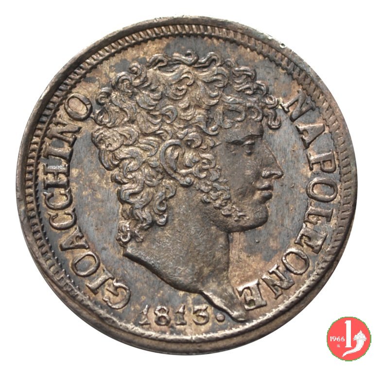 50 centesimi Dritto: Testa di Murat volta a destra, intorno GIOACCHINO - NAPOLEONE, sotto il millesimo (1813 •). Verso: Indicazione del valore (MEZ LIRA) su due righe entro rami di ulivo e alloro. Intorno, REGNO DELLE - DUE SICILIE. | |