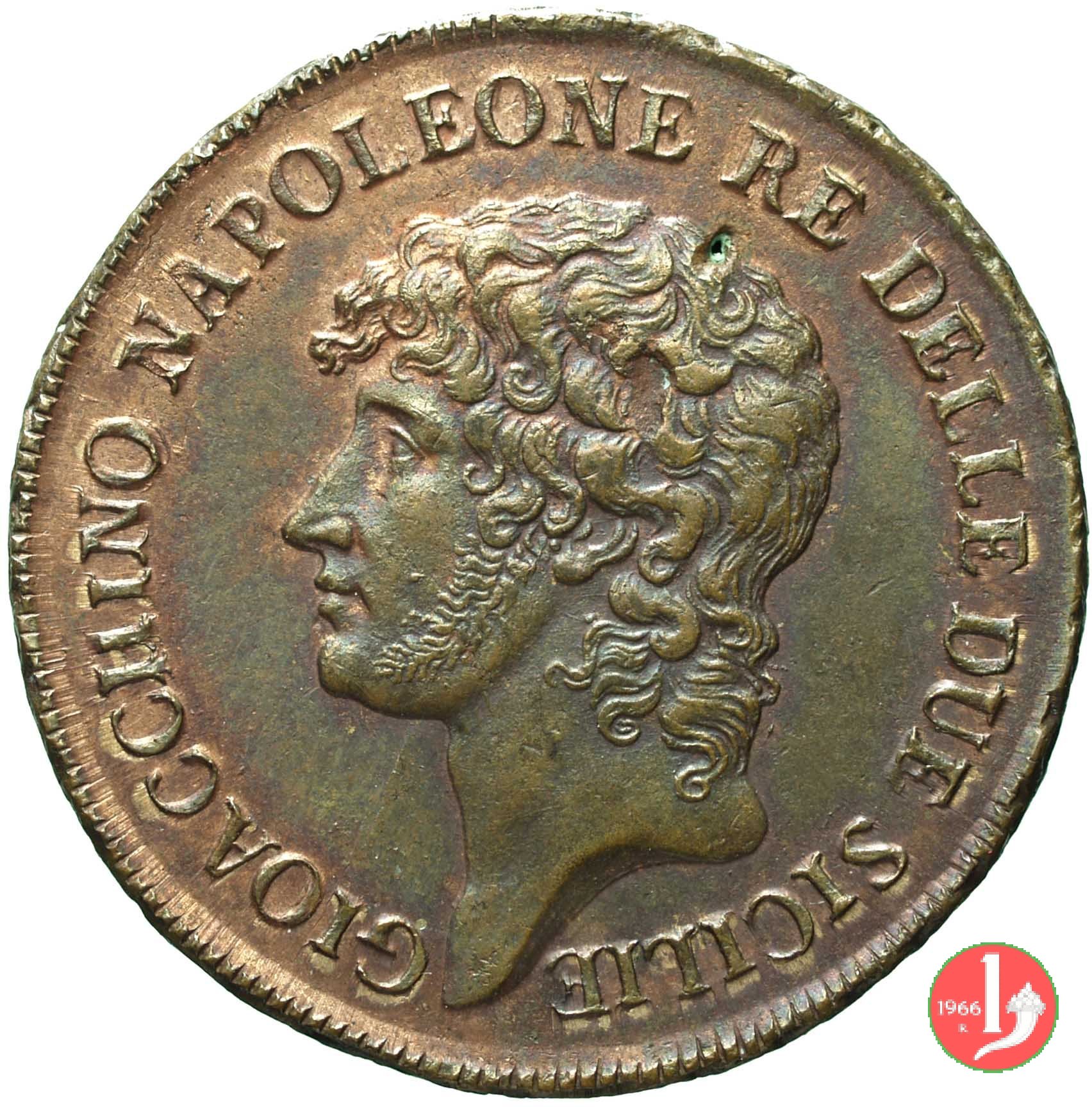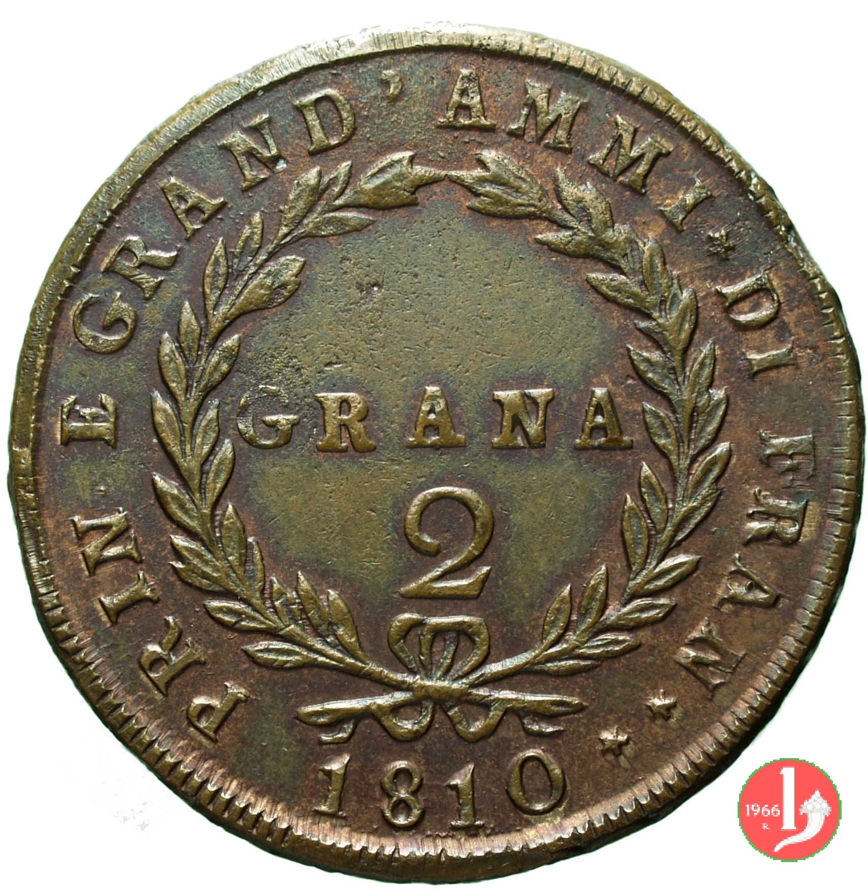2 grana Dritto: Testa di Murat volta a sinistra, lungo il bordo GIOACCHINO NAPOLEONE RE DELLE DUE SICILIE ; (varianti con DEL. e SICI.) Verso: Nel campo indicazione del valore (GRANA / 2) su due righe tra due rami di alloro incrociati. Intorno PRIN • E GRAND'AMMI • DI FRAN • •. In basso, il millesimo (1810). (interpunzonatura con stella a cinque punte o punto) | |