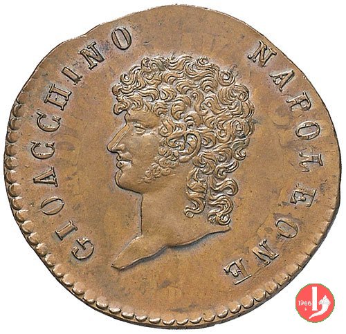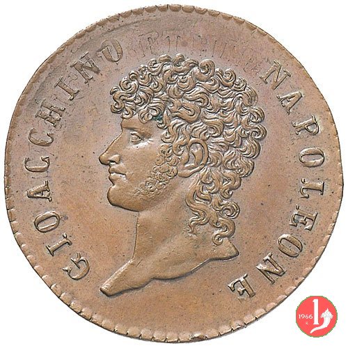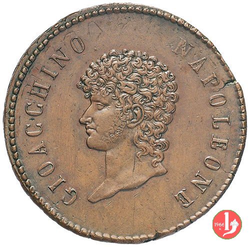 5 centesimi Dritto: Testa di Murat volta a sinistra, intorno GIOACCHINO NAPOLEONE. Verso: Indicazione del valore e del millesimo (5 CENTESIMI 1813) su tre righe. Intorno, REGNO DELLE DUE SICILIE. | |