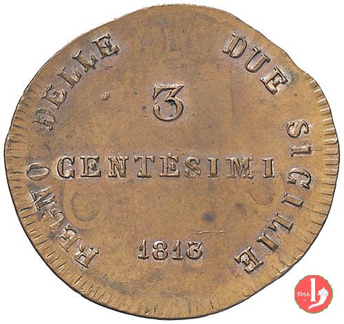 3 centesimi Dritto: Indicazione del valore e del millesimo (3 CENTESIMI 1813) su tre righe. Intorno, REGNO DELLE DUE SICILIE. Verso: Testa di Murat volta a sinistra, intorno GIOACCHINO NAPOLEONE. | |