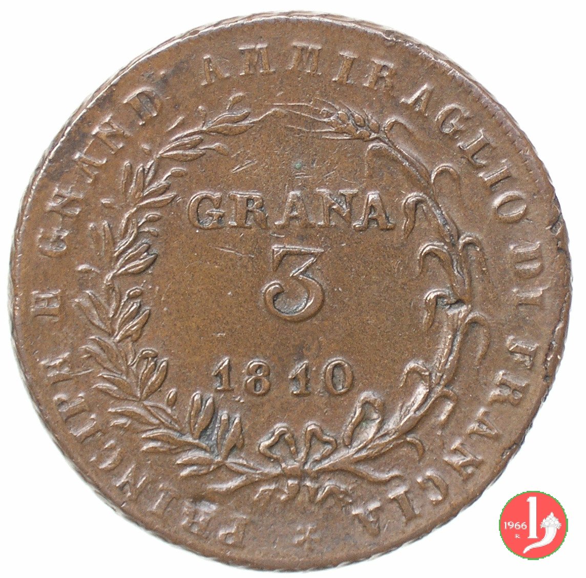 3 grana Dritto: Testa di Murat volta a sinistra, lungo il bordo GIOACCHINO NAP RE DELLE DUE SIC •. Verso: Prima variante: Nel campo indicazione del valore (3 - GRANA) su due righe entro un corona formata da un ramo di olivo e uno stelo di grano con spiga. Intorno PRIN • E GRAND'AMMI • DI FRAN •. In basso, il millesimo (1810 •), Seconda variante: Nel campo indicazione del valore (GRANA - 3 - 1810) su tre righe entro un corona formata da un ramo di olivo e uno stelo di grano con spiga. Intorno PRIN • E GRAND'AMMI • DI FRAN •. In basso rosetta. | |