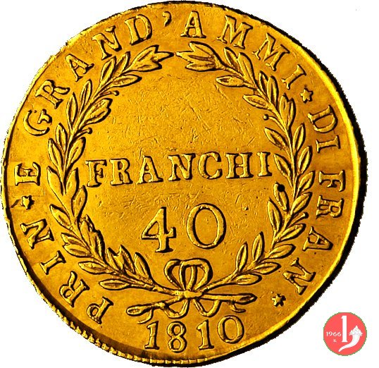 40 franchi Dritto: Testa di Murat volta a sinistra, intorno GIOACCHINO NAPOLEONE RE DEL • DUE SICI • Nel taglio del collo N.M. (incisore Nicola Morghen). Verso: Indicazione del valore (FRANCHI 40) su due righe entro una corona di lauro, intorno PRIN • E GRAND'AMMI DI FRAN • Sotto, il millesimo (1810). | |