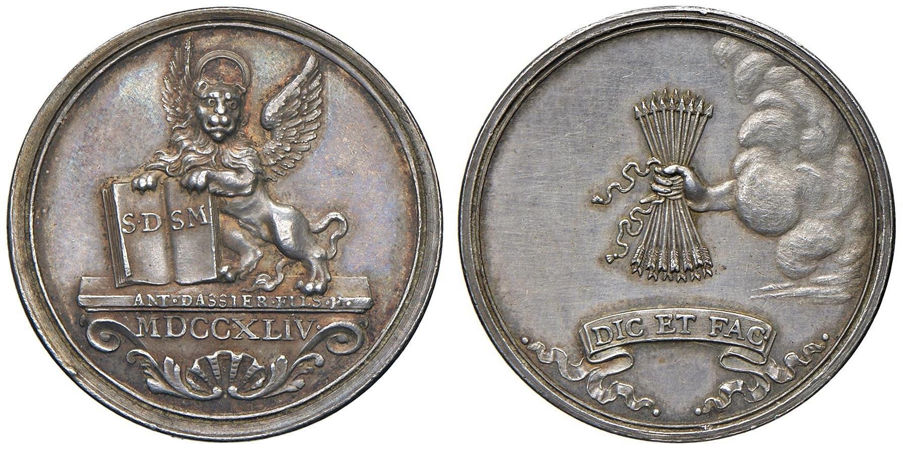 Confini con Stato della Chiesa -V1492 Dritto: Leone di San Marco verso sx con libro aperto con legenda: PAX TIBI MARCE EVANGELISTAMEVS sullo sfondo fortezza e imbarcazioni in esergo: SC Stemmi dei due stati appoggiati a fusto di colonna in esergo: XVII KAL MAII = MDCCXLIX. | |
