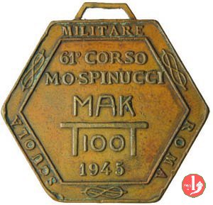 Scuola Militare di Roma Dritto: berretto su pugnale, entro cornice di nodi d' amore Verso: SCUOLA _ MILITARE _ ROMA nel campo: 61° CORSO = MOSPINUCCI = MAK = 100 = 1945 | |
