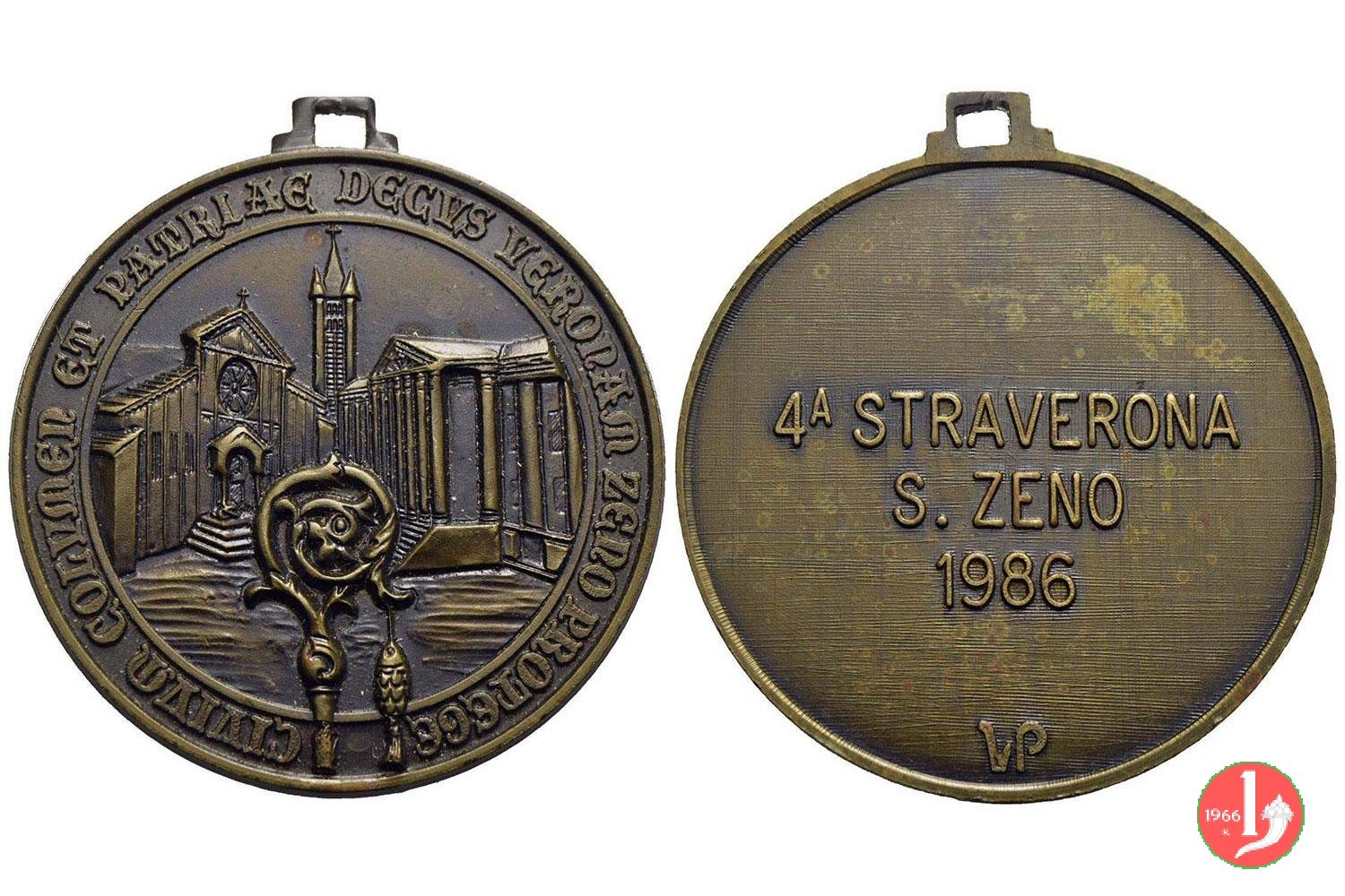 4° StraVerona 1986 Dritto: CIVIVM COLVMEN ET PATRIAE DECVS VERONAM ZENO PROTEGEM entro cornice circolare continua: Vista della Basilica di San Zeno e Palazzo Barbieri a Verona in basso: pastorale di S. Zeno in basso: VP | |