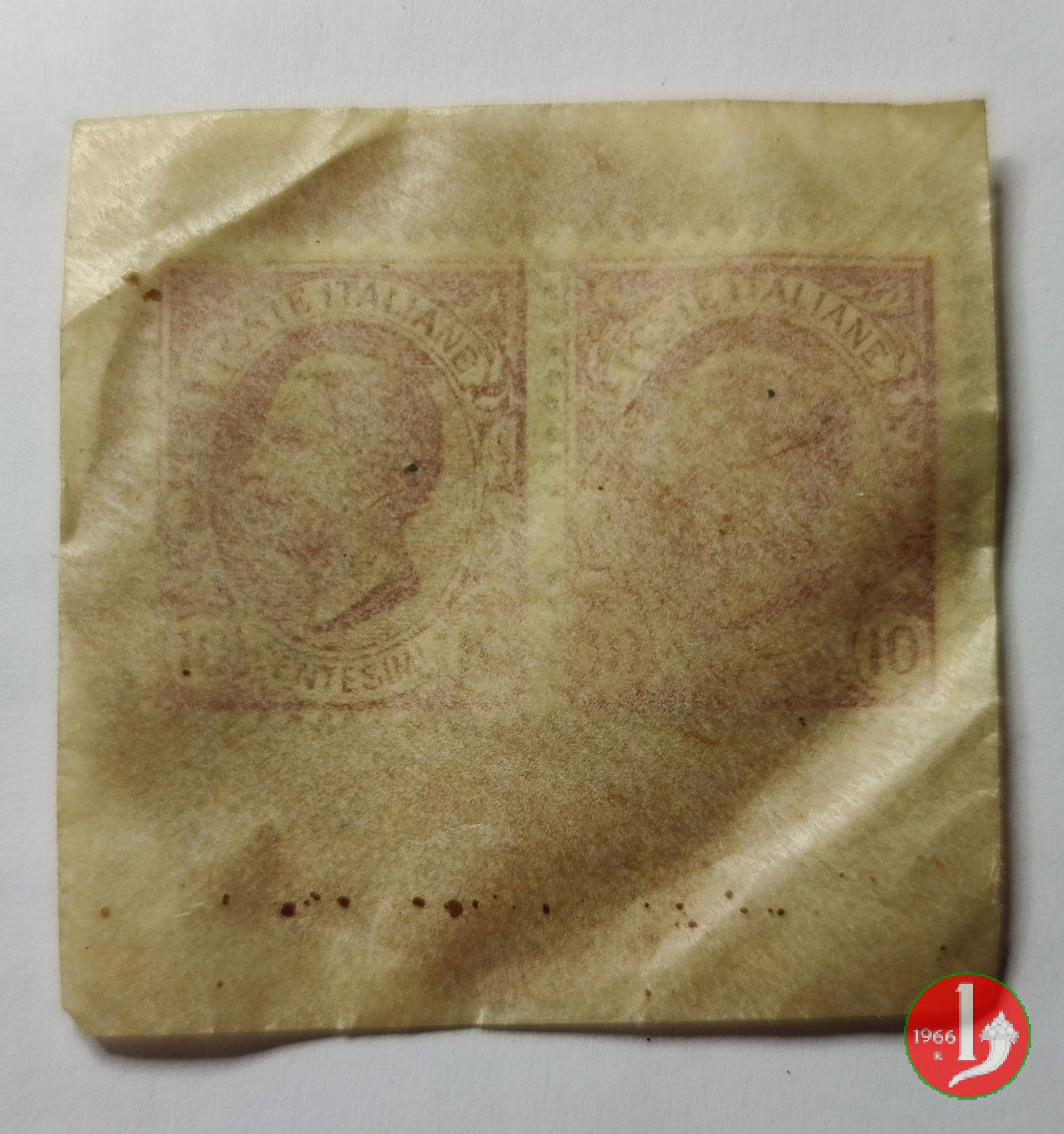 Verso: Carta traslucida che fa intravedere 2 francobolli da 10 centesimi della serie Leoni