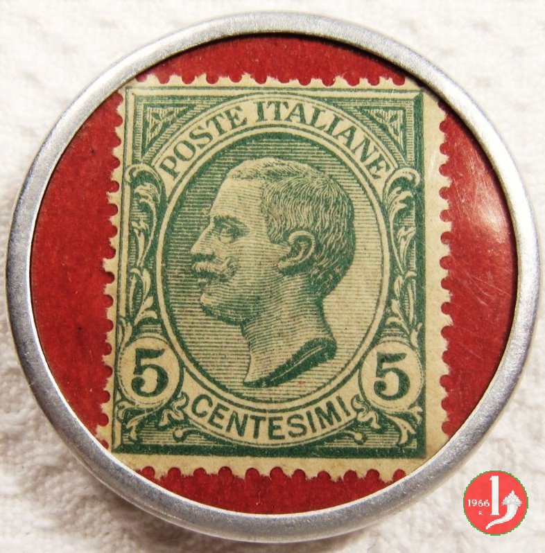 Dritto: Francobollo incapsulato all'interno del tondello in alluminio, protetto da una pellicola di celluloide.