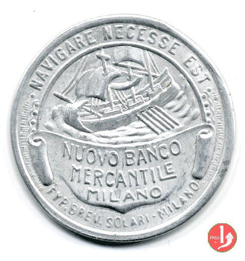 Al centro nave mercantile a remi. Sotto cartiglio con scritto su tre righe NUOVO BANCO MERCANTILE MILANO