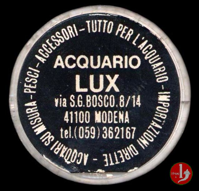 Modena - Acquario Lux Dritto: Marchio STUDIO PANIZZOLI - MILANO MOD. DEP. su plastica trasparente. Francobollo di vari valori serie siracusana. Verso: Pubblicità Acquario Lux | |