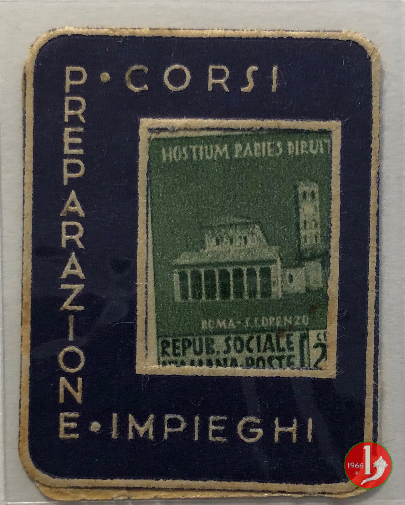 Cornaldo Dattilografia Stenografia Contabilità Lingue Calligrafia Dritto: in alto la scritta Corsi, sotto la scritta Impieghi, al centro francobollo incapsulato della serie monumenti distrutti della Repubblica Sociale Italiana. A lato sinistro la scritta Preparazione Verso: Cornaldo Dattilografia Stenografia Contabilità Lingue Calligrafia | |