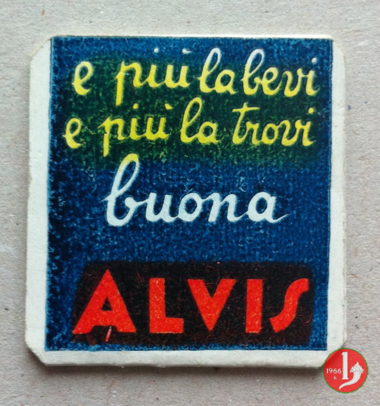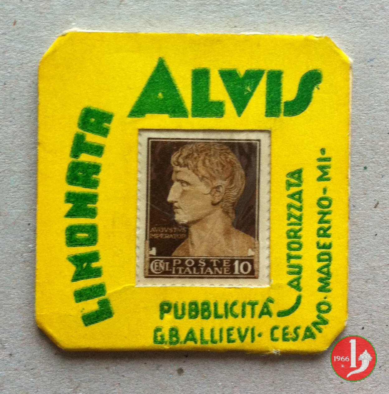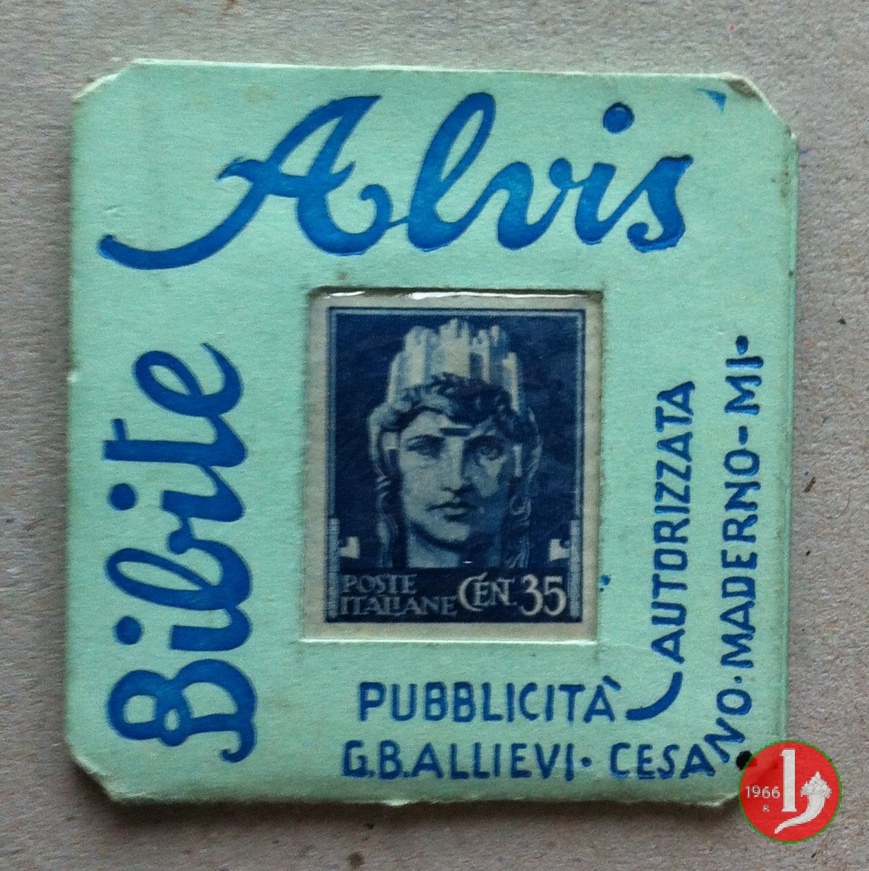Alvis Bibite - e piú la bevi... Dritto: Cartoncino con francobollo protetto da plastichina trasparente. Disposto intorno da sinistra: Bibite Alvis - PUBBLICITA' AUTORIZZATA G.B. ALLIEVI • CESANO MADERNO • MI Verso: su 4 righe motto "E piú la bevi e piú la trovi buona ALVIS" | |