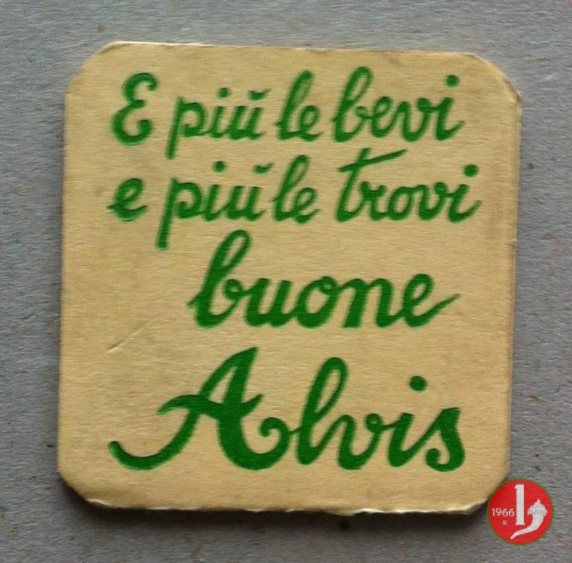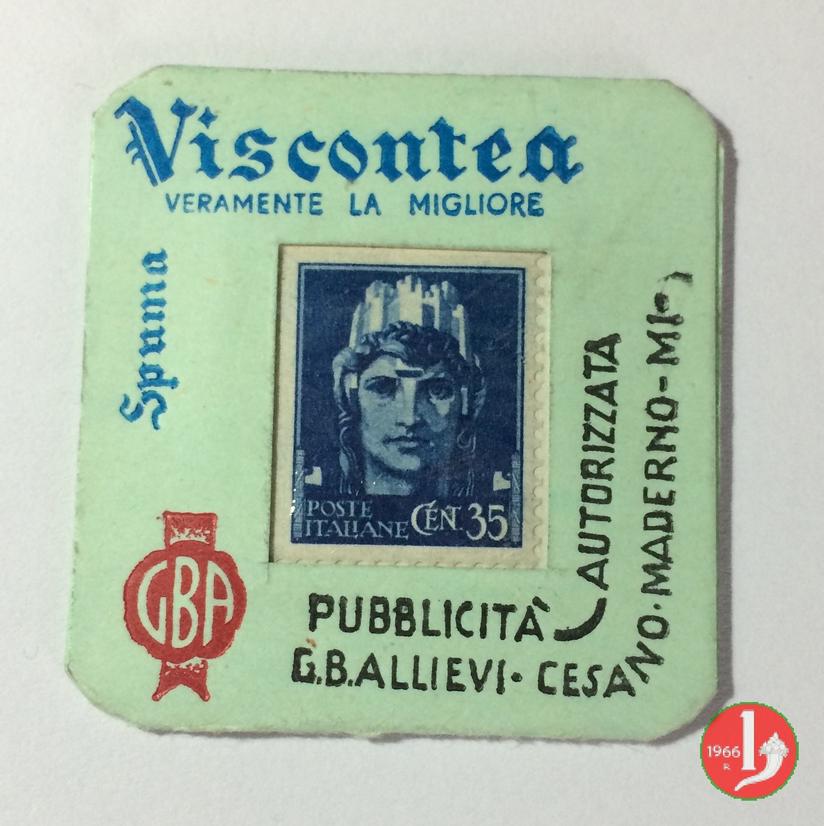 Alvis Spuma Viscontea - e piú la bevi... Dritto: Cartoncino con francobollo protetto da plastichina trasparente. Disposto intorno da sinistra: (marchio GBA) Spuma Viscontea "veramente la migliore" - PUBBLICITA' AUTORIZZATA G.B. ALLIEVI • CESANO MADERNO • MI Verso: su 4 righe motto "E piú la bevi e piú la trovi buona ALVIS" | |