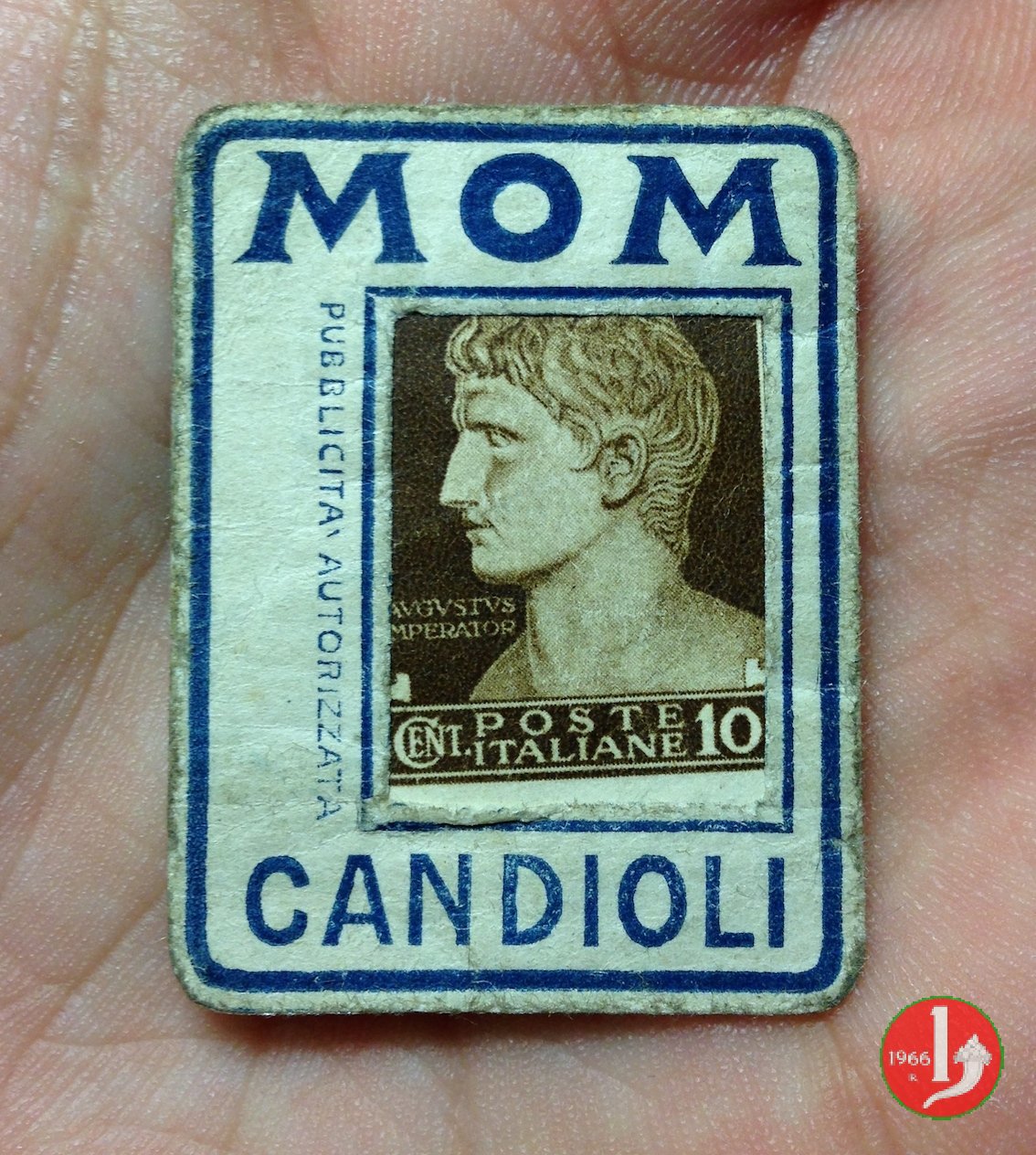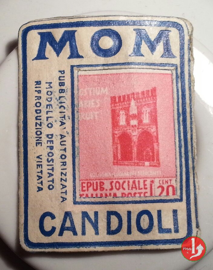 Candioli MOM 1° tipo serie monumenti distrutti Dritto: in alto la scritta MOM, sotto la scritta Candioli, al centro francobollo incapsulato della serie monumenti distrutti della Repubblica Sociale Italiana. A lato sinistro su 3 righe dicitura "PUBBLICITA' AUTORIZZATA" Verso: MOM Polvere antiparassitaria e sotto messaggio pubblicitario. | |
