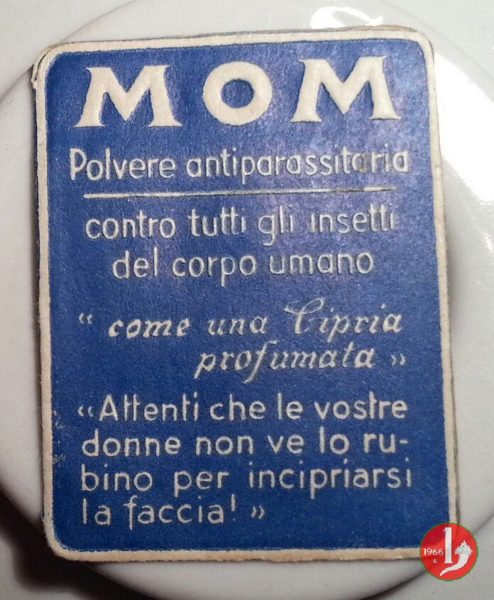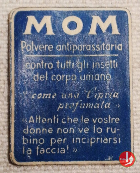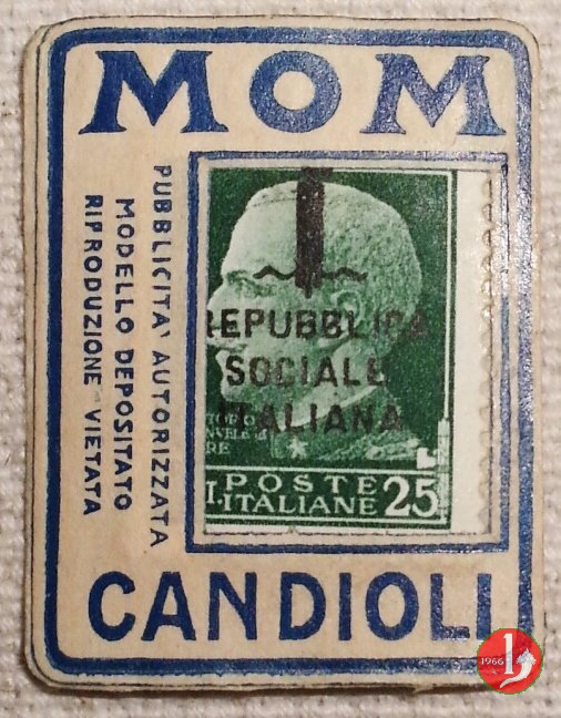 Candioli MOM 2° tipo serie imperiale Dritto: in alto la scritta MOM, in basso la scritta Candioli, al centro francobollo incapsulato con sovrastampato fascio Littorio o scritta Repubblica Sociale Italiana. A lato sinistro su 3 righe dicitura "PUBBLICITA' AUTORIZZATA MODELLO DEPOSITATO RIPRODUZIONE VIETATA" Verso: MOM Polvere antiparassitaria e sotto messaggio pubblicitario. | |