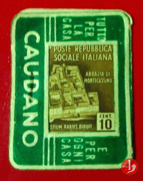 Candioli MOM 2° tipo serie monumenti distrutti Dritto: in alto la scritta MOM, sotto la scritta Candioli, al centro francobollo incapsulato della serie monumenti distrutti della Repubblica Sociale Italiana. A lato sinistro su 3 righe dicitura "PUBBLICITA' AUTORIZZATA MODELLO DEPOSITATO RIPRODUZIONE VIETATA" Verso: MOM Polvere antiparassitaria e sotto messaggio pubblicitario. | |