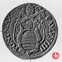 Giulio (con S.Paolo - I t.) Dritto: •PAVLVS •IIII •__ •PONT •MAX • /Stemma ovale in cornice a trafori e volute con cimasetta, sormontato da chiavi dec. e tiara Verso: S •PAVLVS__ ![]() ANCONA • /S.Paolo nimbato, in piedi di fronte, spada eretta nella destra e libro aperto nella sinistra | |