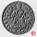 Testone (1557 - con volute e globo) Dritto: • •PAVLVS •IIII •__ •PONT •MAX • • /Stemma ovale con cornice ornata di volute e 2 maschere leonine ai lati, cimasa sopra di volute e globo, sormontato da chiavi dec. e tiara Verso: •S •PETRVS •__ •APOSTOLVS • (anzichè pallini sono piccoli cunei triangolari)/S.Pietro con triregno, seduto su un trono con due protoni di leoni. benedice con la destra e con la sinistra tiene le chiavi; in Esergo •AN ![]() CO • ||15__57|| | |