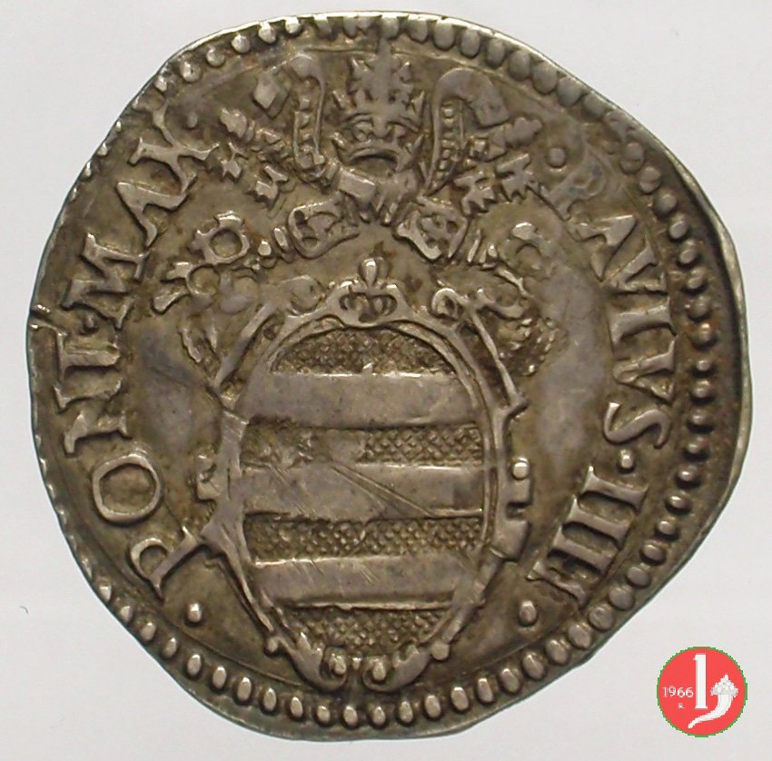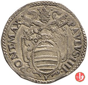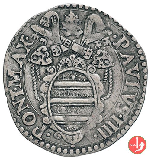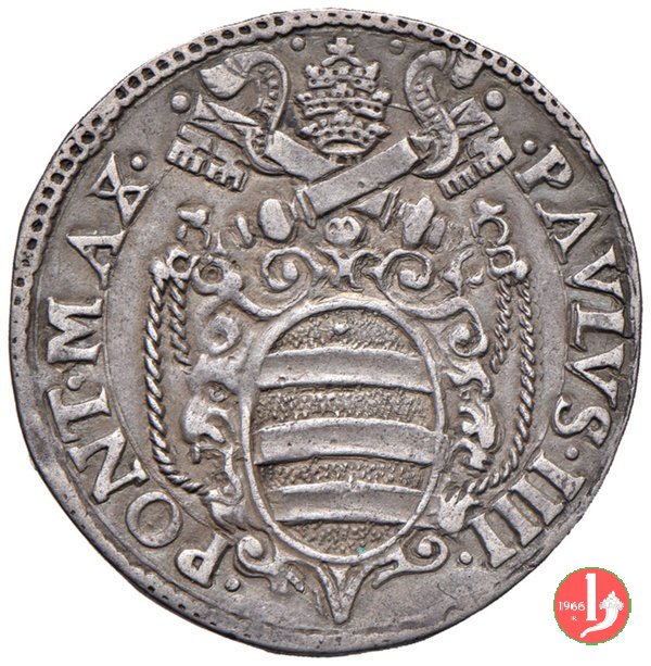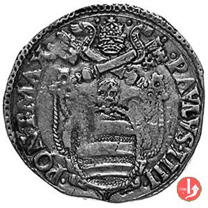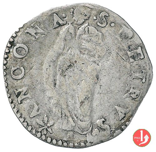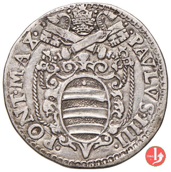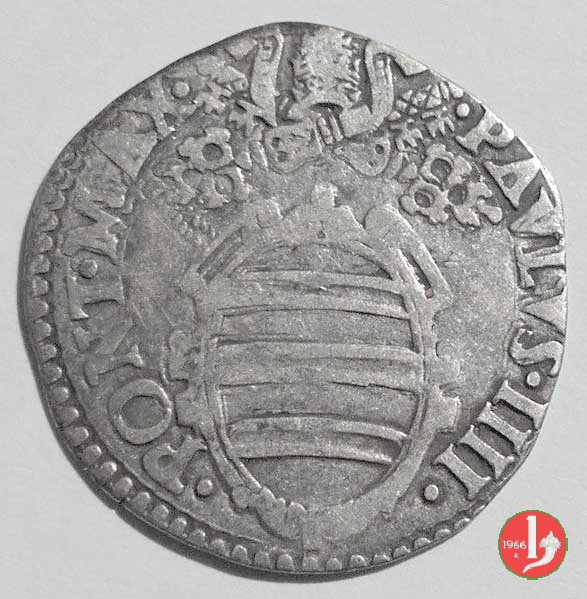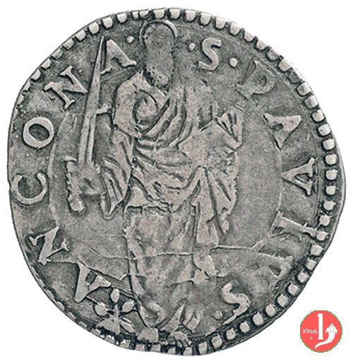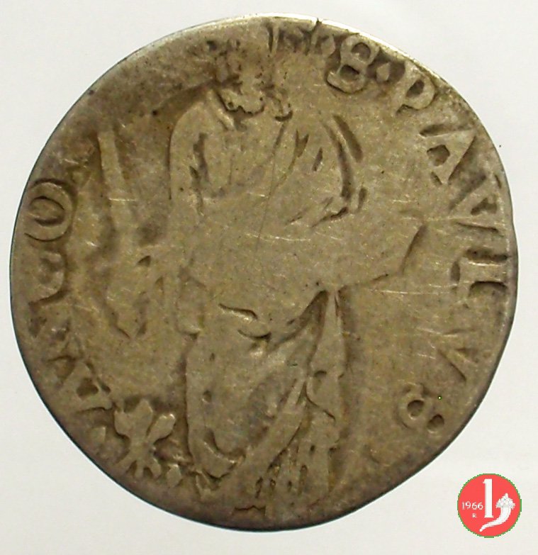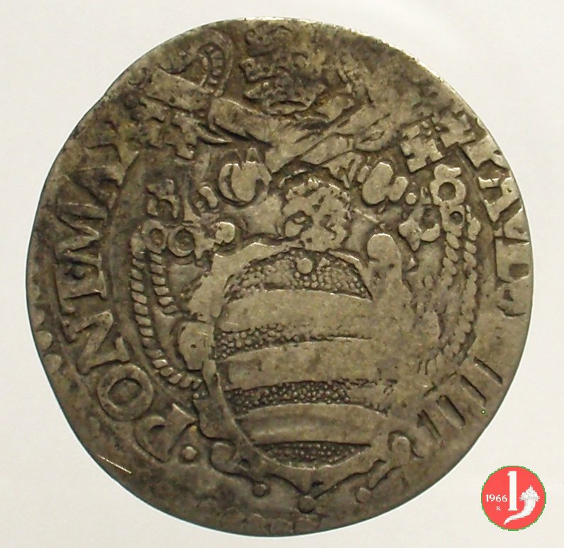 Testone (senza data - con volute e globo) Dritto: • •PAVLVS •IIII •__ •PONT •MAX • • /Stemma ovale con cornice ornata di volute e 2 maschere leonine ai lati, cimasa sopra di volute e globo, sormontato da chiavi dec. e tiara Verso: •S •PETRVS •__ •APOSTOLVS • /S.Pietro con triregno, benedice e tiene le chiavi, seduto su un trono con due protomi di leone; in Esergo •ANC. ![]() .ONA • | |