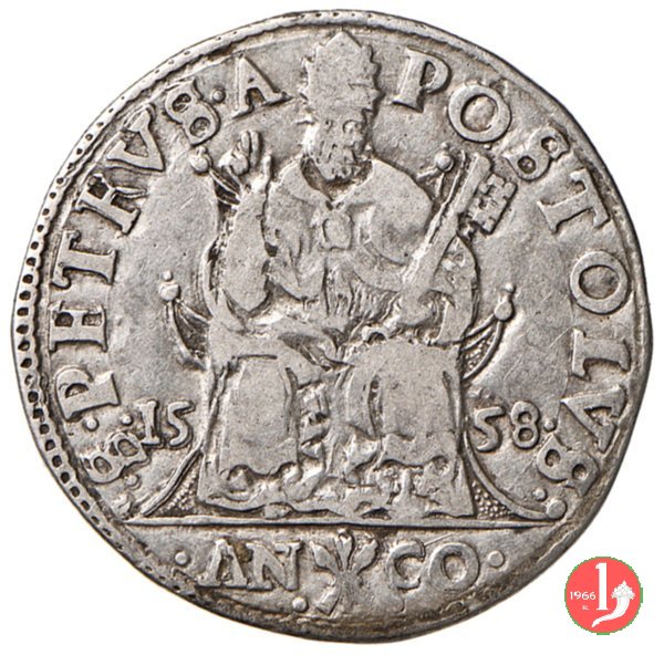 Testone (1558) Dritto: • •PAVLVS •IIII •__ •PONT •MAX • • /Stemma ovale con cornice ornata di volute e 2 maschere leonine ai lati, cimasa sopra di volute e globo, sormontato da chiavi dec. e tiara Verso: S •PETRVS •__ •APOSTOLVS • /S.Pietro con triregno, seduto su un trono con spalliera piú alta delle spalle, benedice con la destra e con la sinistra tiene le chiavi;nel campo, ai lati, •15 -58 • ; in Esergo •AN. ![]() .CO • | |