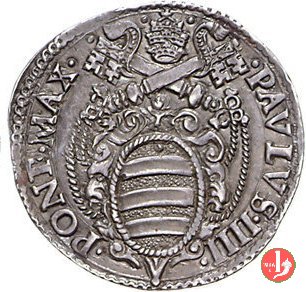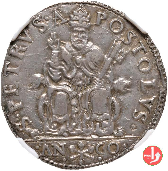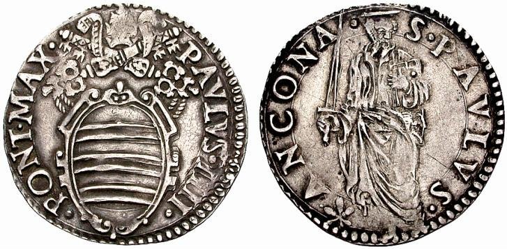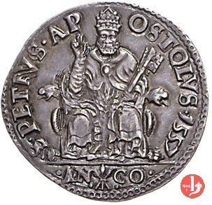 Testone (1557 - con testa leonina) Dritto: • •PAVLVS •IIII •__ •PONT •MAX • • /Stemma ovale con cornice ornata di volute e 2 maschere leonine ai lati, cimasa sopra con testa di leone, sormontato da chiavi dec. e tiara Verso: •S •PETRVS •__ •APOSTOLVS • /S.Pietro con triregno, seduto su un trono con due protoni di leoni. benedice con la destra e con la sinistra tiene le chiavi; in Esergo •ANC ![]() ONA • || •15__57 •|| | |