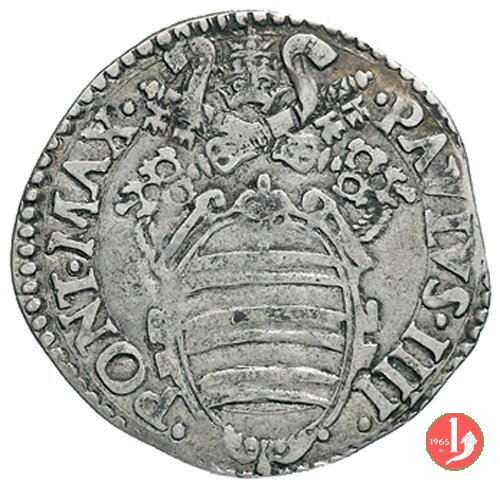 Testone (senza data - con volute e cerchietto) Dritto: • •PAVLVS •IIII •__ •PONT •MAX • • /Stemma ovale con cornice ornata di volute e cerchietto, contorno di piccoli ovoli, sormontato da chiavi dec. e tiara Verso: •S •PETRVS •__APOSTOLVS /S.Pietro con triregno, benedicente e con chiavi, seduto su trono con due protomi di leone; in Esergo •AN. ![]() .CO • ; contorno di piccoli ovoli | |