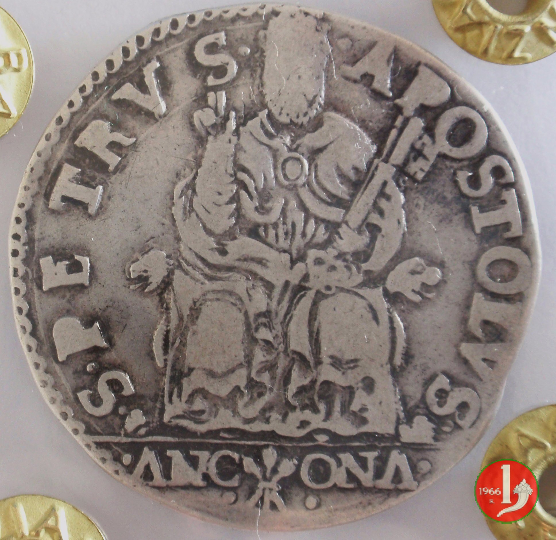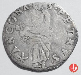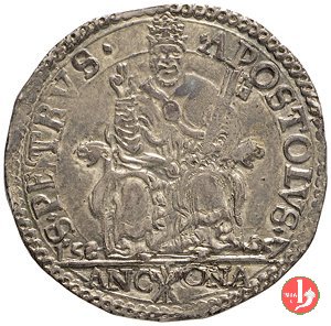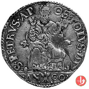 Giulio (con S.Pietro - II t.) Dritto: •PAVLVS •IIII •__ •PONT •MAX • /Stemma ovale in cornice a trafori e volute, sormontato da chiavi dec. e tiara Verso: •S •PETRVS •__ ![]() ANCONA • /S.Pietro, in piedi di fronte con chiavi nella destra tiene il libro aperto con ambo le mani appoggiato sul ginocchio destra, e con il piede destra su sgabello | |