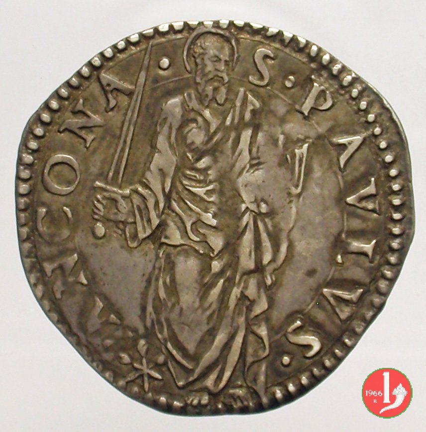 Giulio (con S.Paolo - V t.) Dritto: •PAVLVS •IIII •__ •PONT •MAX • /Stemma ovale con cornice di due maschere e cimasa gigliata/cimasetta, sormontato da chiavi dec. e tiara Verso: •S •PAVLVS__ ![]() ANCONA • /S.Paolo nimbato, in piedi di fronte, spada eretta nella destra e libro aperto nella sinistra |