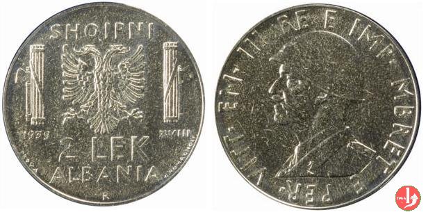 prova 2 lek Dritto: Semibusto in uniforme ed elmato del Re volto a sinistra. Intorno la scritta VITT • EM • III RE E IMP • MBRET E PER • Verso: Aquila bicipite albanese contornata da due fasci con le scuri verso l'esterno. Sotto il fascio di sinistra, il millesimo, sotto quello di destra, l'anno dell'Era Fascista. In alto SHQIPNI, sotto, indicazione del valore (2 LEK) e ALBANIA su due righe. A ore 6 il segno di zecca, da ore 4 a ore 5 lungo il bordo, indicazione dell'autore (G. ROMAGNOLI). A sinistra, circolarmente, in basso, "PROVA". | |