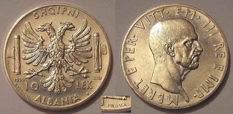 prova 10 lek Dritto: Testa del Re volta a destra. Intorno la scritta VITT EM III RE E IMP MBRET E PER • Verso: Aquila bicipite albanese contornata da due fasci con le scuri verso l'esterno. Sotto il fascio di sinistra, il millesimo, sotto quello di destra, l'anno dell'Era Fascista e segno di zecca (R) su due righe. Ai lati della coda dell'aquila, indicazione del valore (10 LEK). Lungo il bordo, in alto SHQIPNI, in basso ALBANIA. Da ore 7 a ore 8 lungo il bordo, indicazione dell'autore (G. ROMAGNOLI). Circolarmente, a sinistra, "PROVA". |
