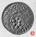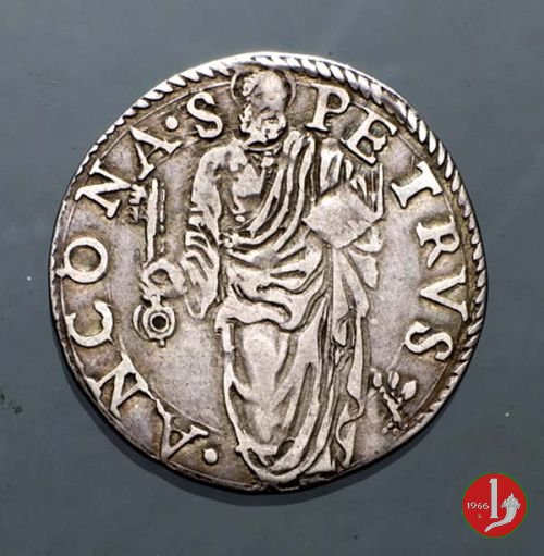 Giulio (senza data - II t.) Dritto: PIVS •IIII •__ •PONT •MAX • /Stemma ovale in cornice a trafori e volute a cartoccio, sormontato da chiavi dec. e tiara Verso: S__PETRVS ![]() __ANCONA • /S.Pietro nimbato in piedi di fronte, nella destra chiavi volte all'infuori e nella sinistra libro aperto |
