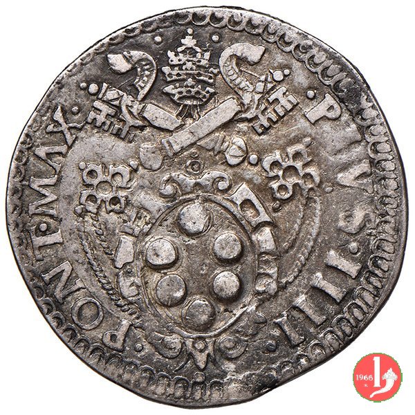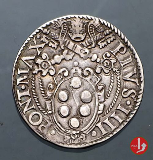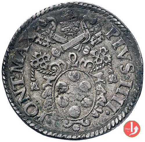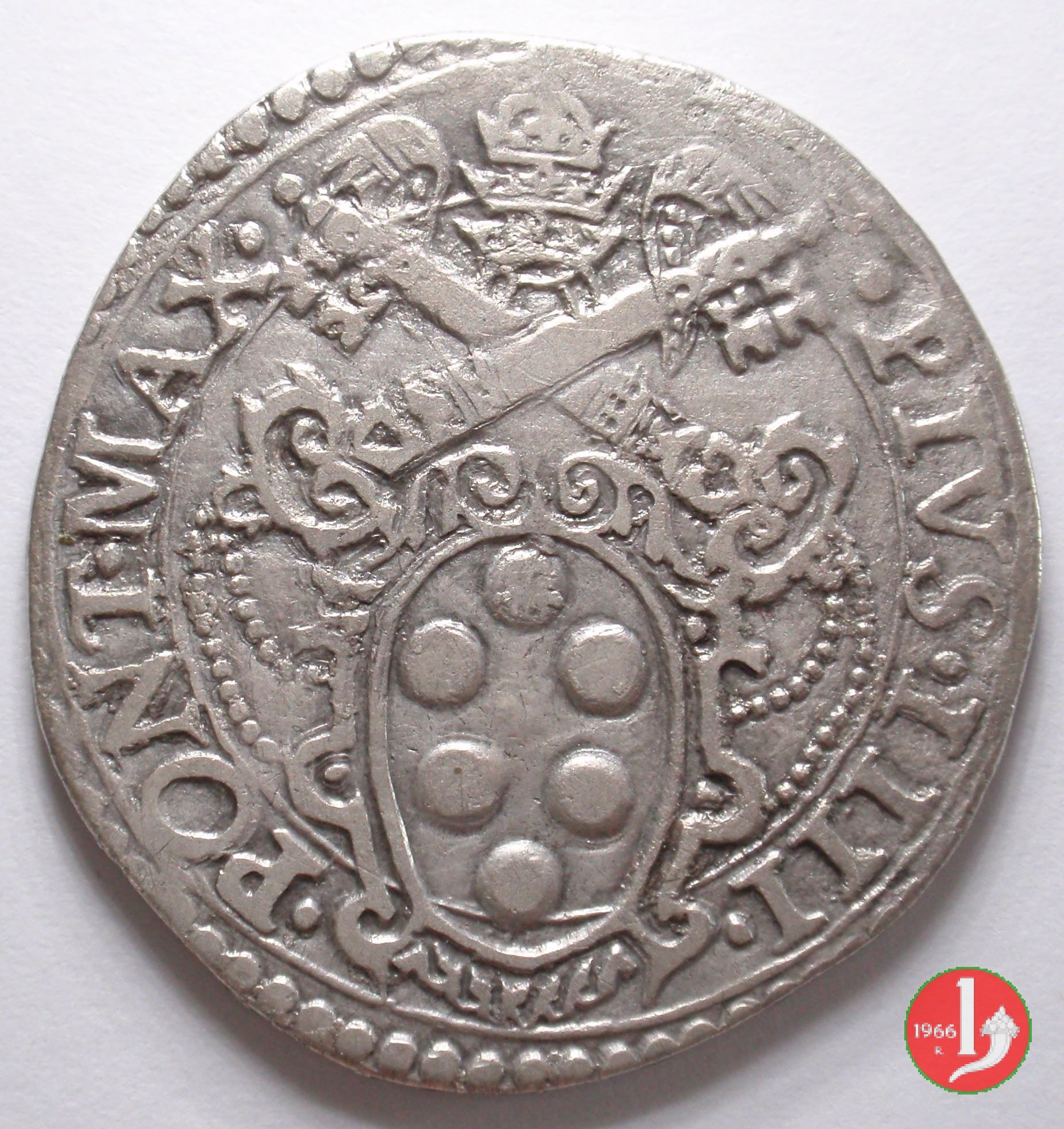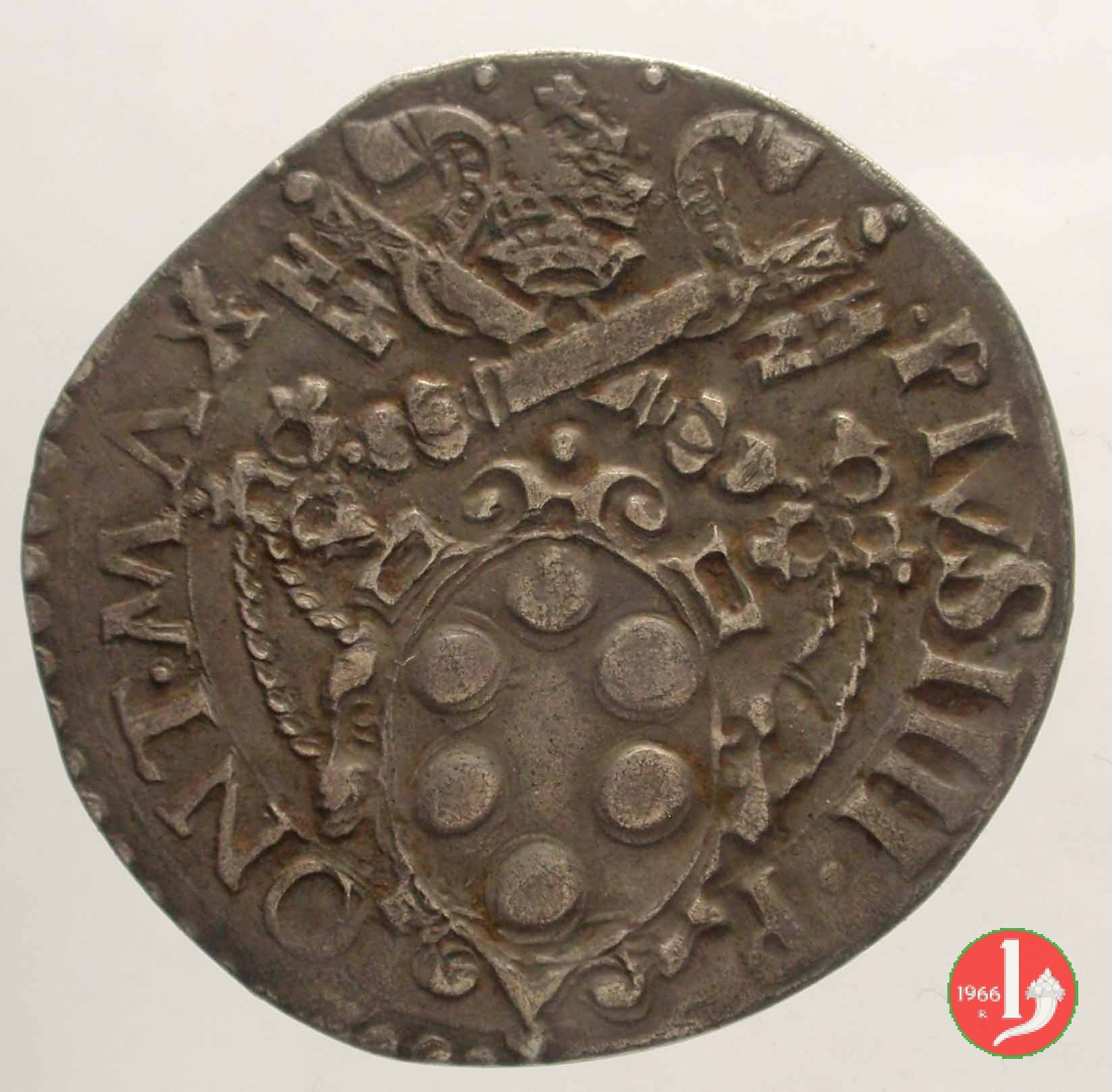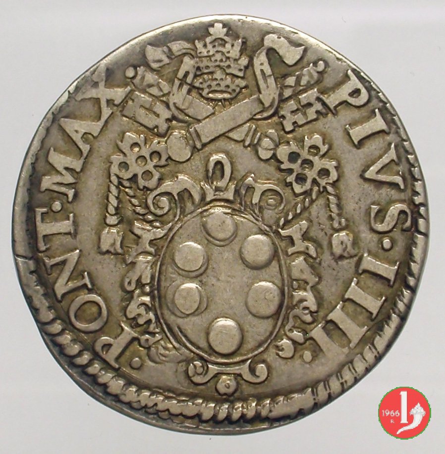 Testone (senza data - III t.) Dritto: •PIVS IIII •__ •PONT •MAX •/Stemma ovale in cornice ornata di due maschere ai lati con cimasa e cerchietto, sormontato da chiavi dec. e tiara Verso: •S •PETRVS • ![]() __APOSTOLVS • /S.Pietro nimbato seduto di fronte, benedice con la destra e con la sinistra tiene le chiavi; in Esergo •ANCO • | |