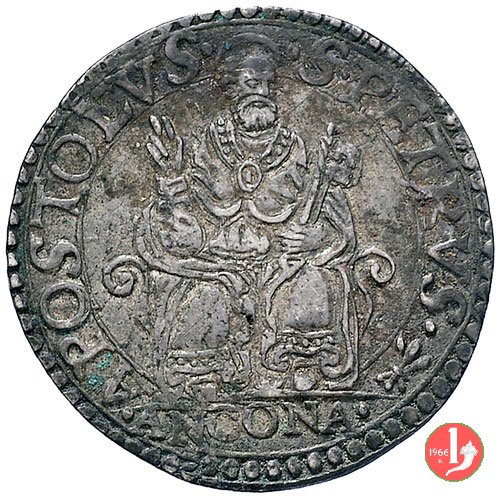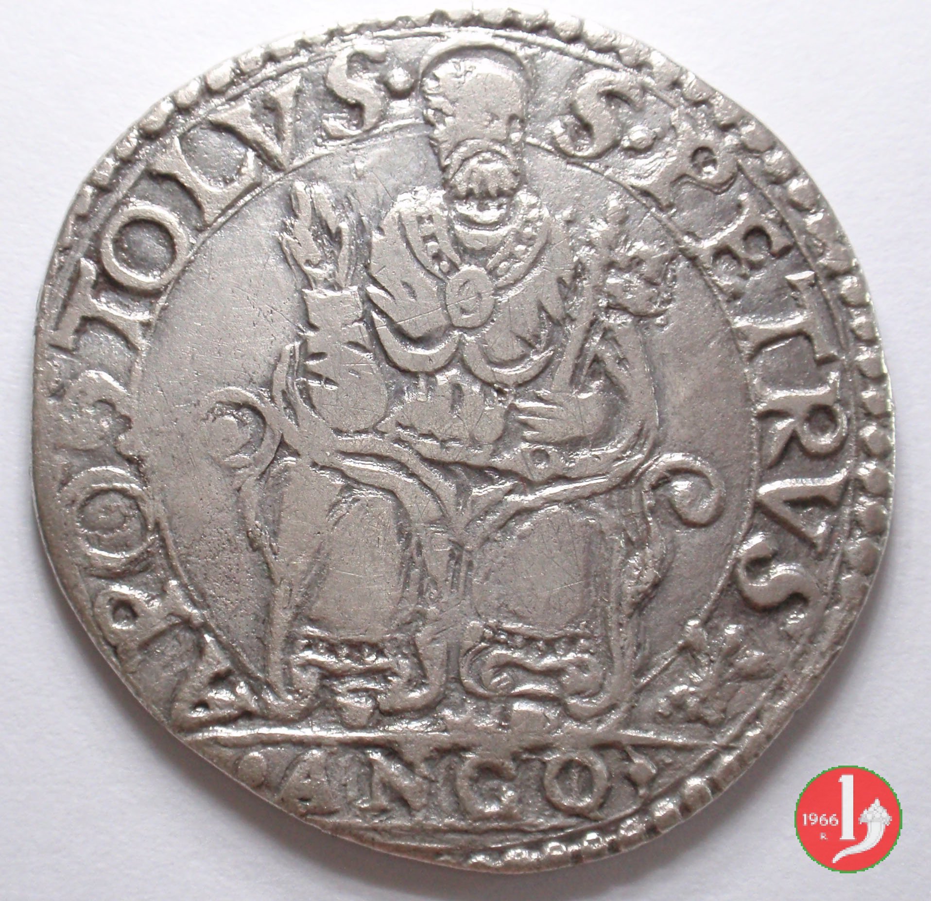 Testone (1563 - I t.) Dritto: •PIVS •IIII •__ •PONT •MAX /Stemma ovale in cartella ornata di due maschere ai lati e cimasa con cerchietto, sormontato da chiavi dec. e tiara Verso: •S •PETRVS •__APOSTOLVS • /S.Pietro nimbato e seduto di fronte, testa leggermente a destra, benedice con la destra e tiene con la sinistra le chiavi; nel campo al centro 15__63; in Esergo AN ![]() CO | |