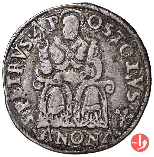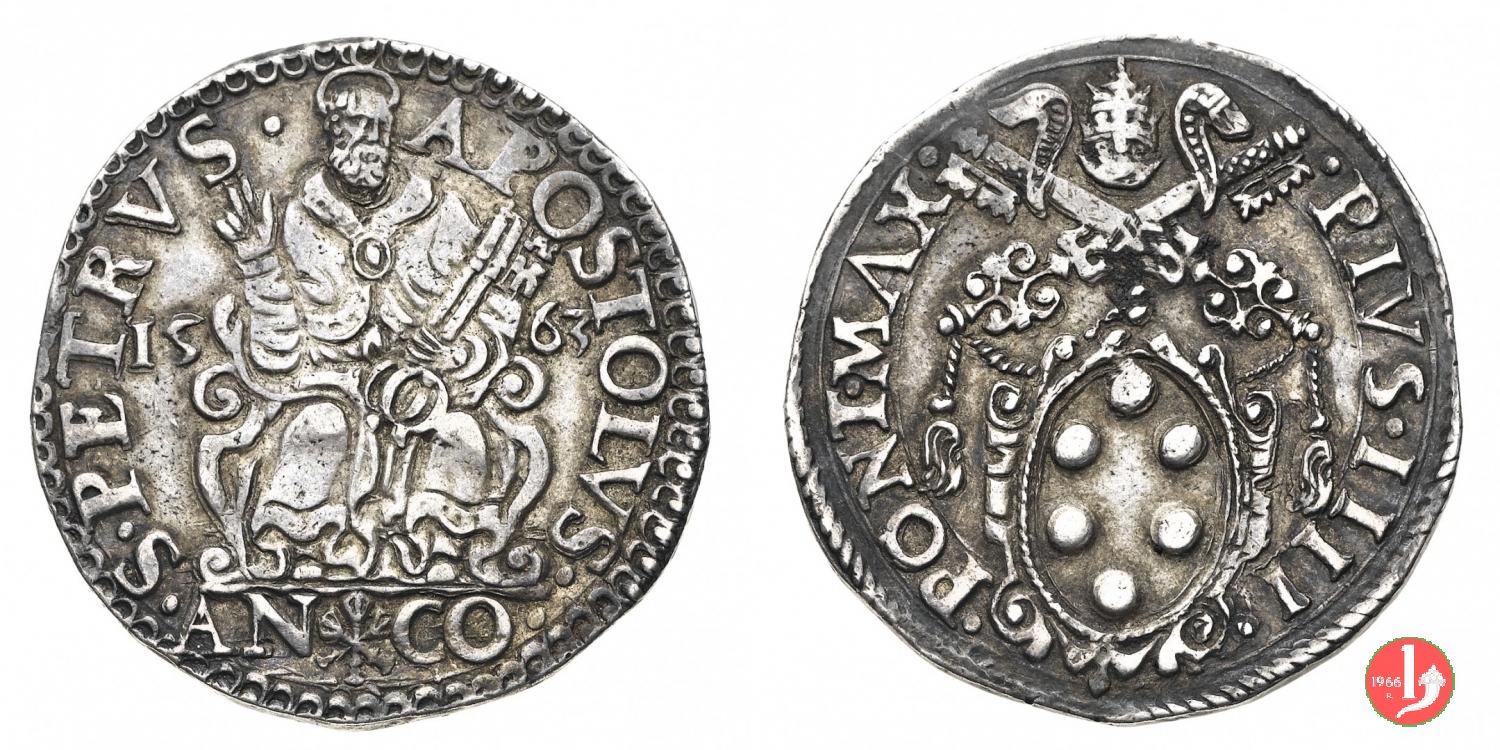 Testone (1563 - III t.) Dritto: • PIVS •IIII •__PONT •MAX • /Stemma ovale in cartella con cornice ornata di cartocci, cimasa con cerchietto, sormontato da chiavi dec. e tiara Verso: •S •PETRVS •__APOSTOLVS /S.Pietro nimbato seduto di fronte, testa leggermente a destra, benedice con la destra e con la sinistra tiene le chiavi; nel campo al centro 15__63; in Esergo AN ![]() CO | |