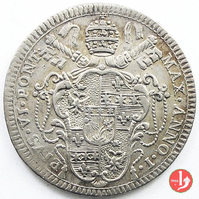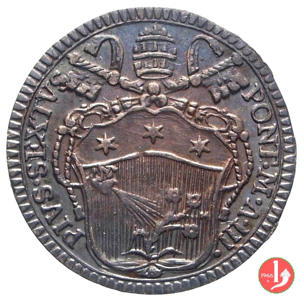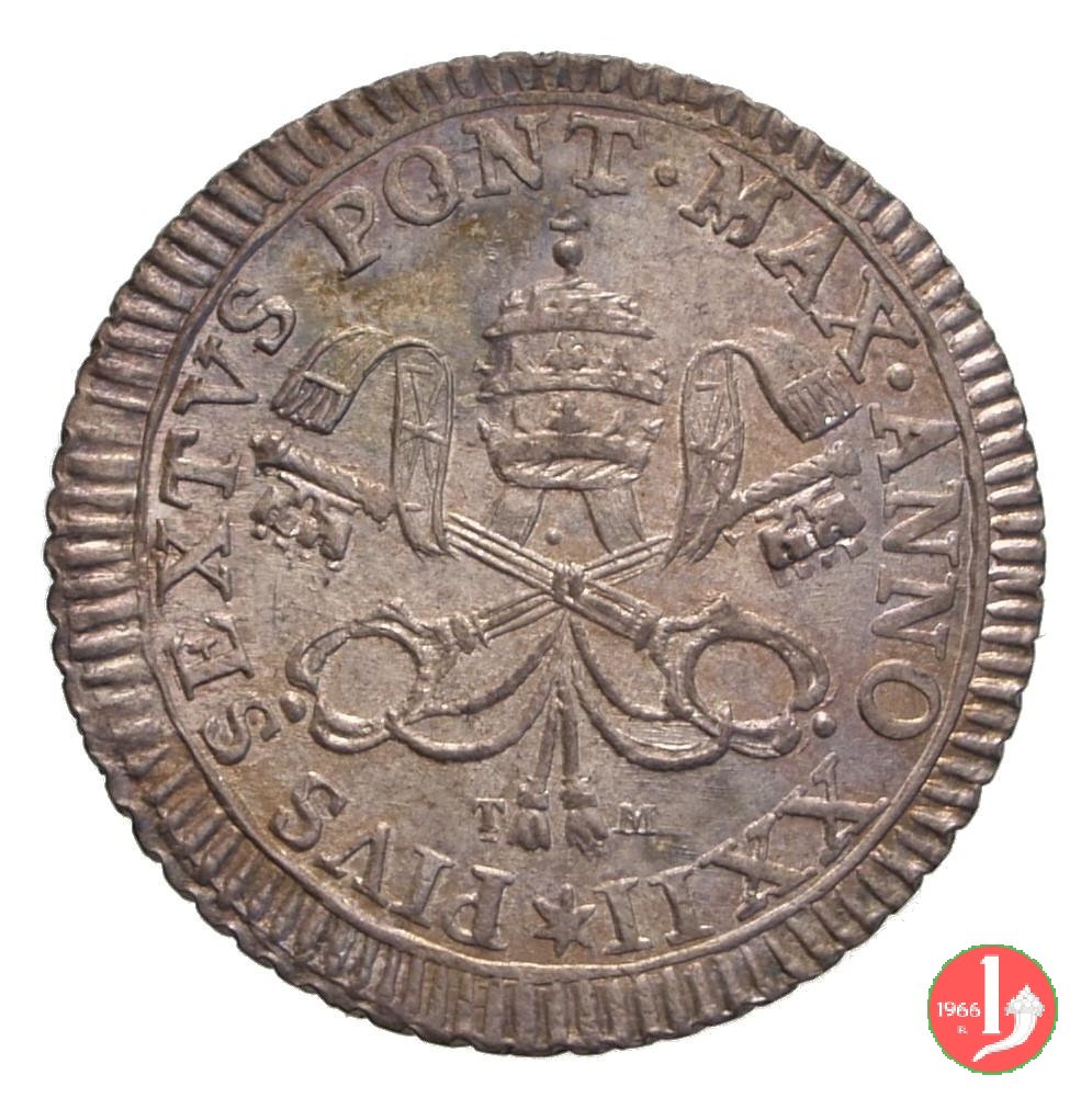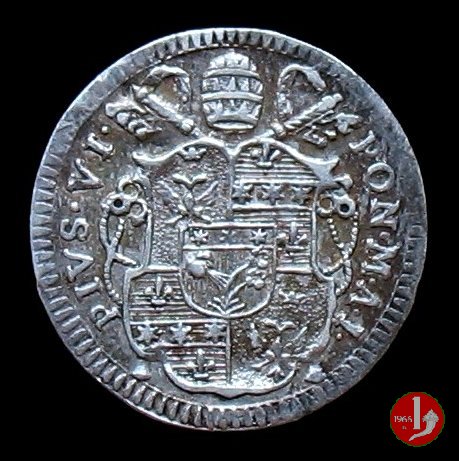 testone Dritto: Stemma di Pio VI. Chiavi. Inizio della leggenda da sinistra in basso. PIVS • SEXTVS - PONT • M • A • anno pontificato Verso: Figure di San Pietro (a sinistra) e Sant'Andrea. In alto: raggi spioventi. Inizio della leggenda da sinistra in basso. SANCTVS • PET - RVS • SANCTVS • - ANDREAS • - Esergo: millesimo ai lati di armetta prelatizia con cappello. | |