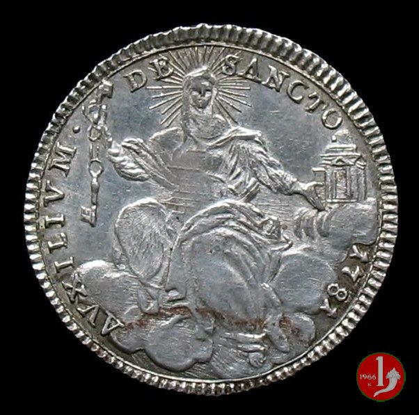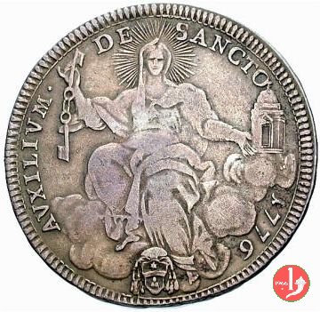 scudo romano Dritto: Stemma ovale in cornice fra due rami d'olivo in basso, tiara radiante, chiavi con doppi cordoni. Inizio della leggenda da sinistra in basso: PIVS SEXTVS - PONT • M • A • VI Verso: La chiesa seduta su nubi. Inizio delle leggenda da sinistra in basso: AVXILIVM - DE - SANCTO - 1780 - In basso armetta a targa. | |