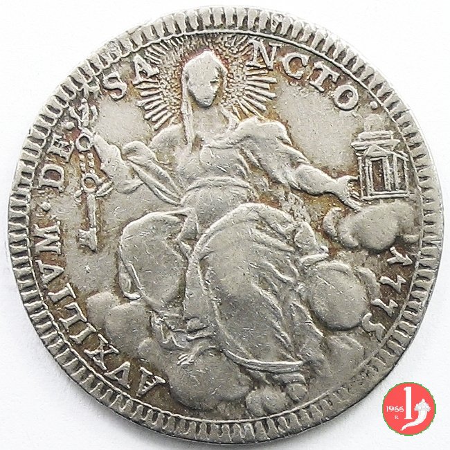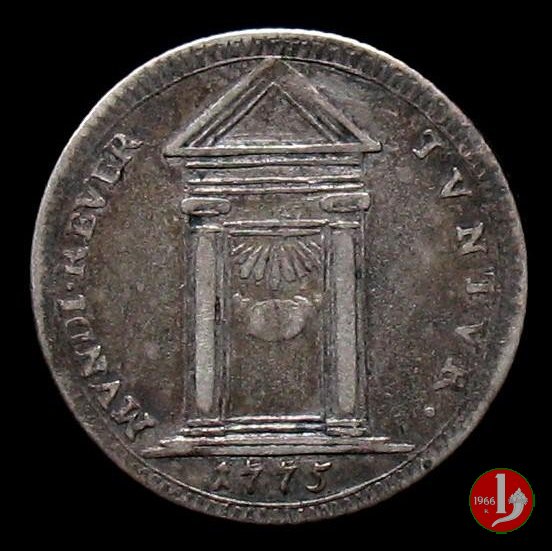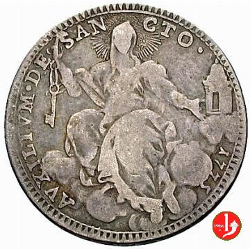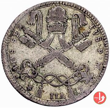 doppio giulio del II tipo (stemma composito) Dritto: Stemma composito di Pio VI, scudo a targa. (s) PIVS VI PONT - MAX ANNO I (s) AVXILIVM DE - SA - NCTO - 1775 | |