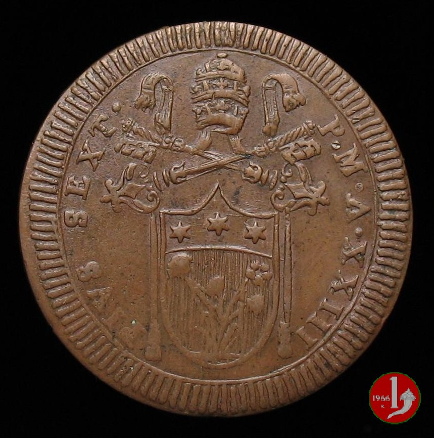 2 baiocchi del 2° tipo (A. XXIII) Dritto: Stemma semiovale, cimasa a punta, chiavi con fiocchi; inizio della leggenda da sinistra in basso: PIVS • SEXT • - P • M • A • XXIII Verso: DVE || BAIOCCHI || ROMANI in corona di foglie trinate piccole, a mazzetti compatti. | |