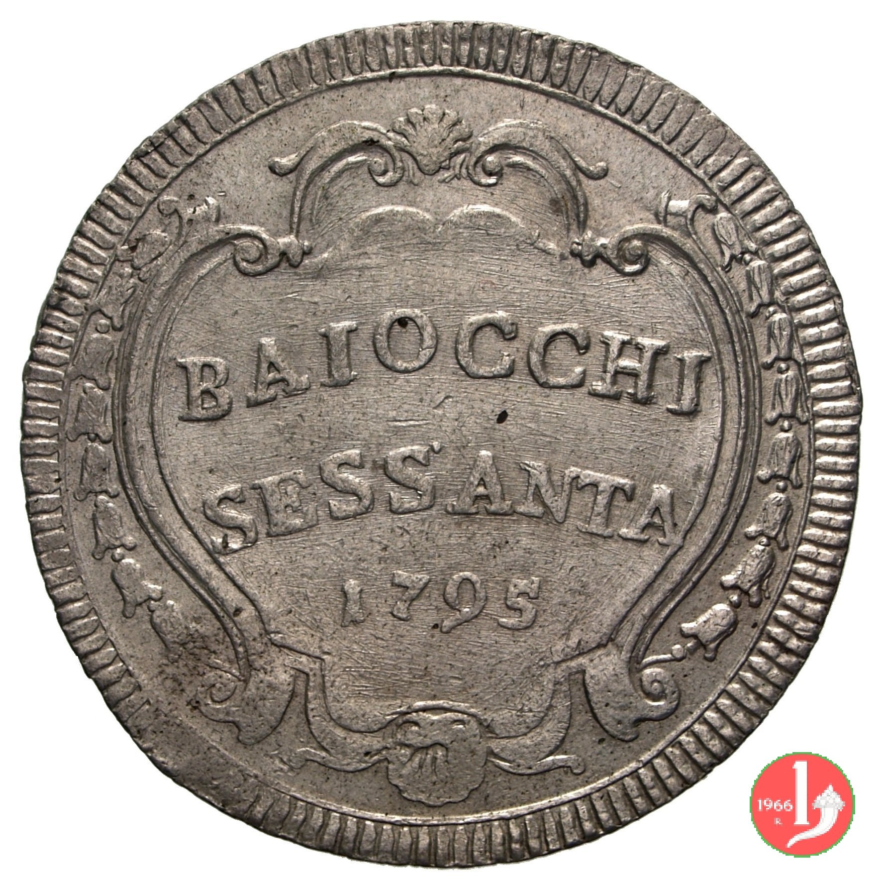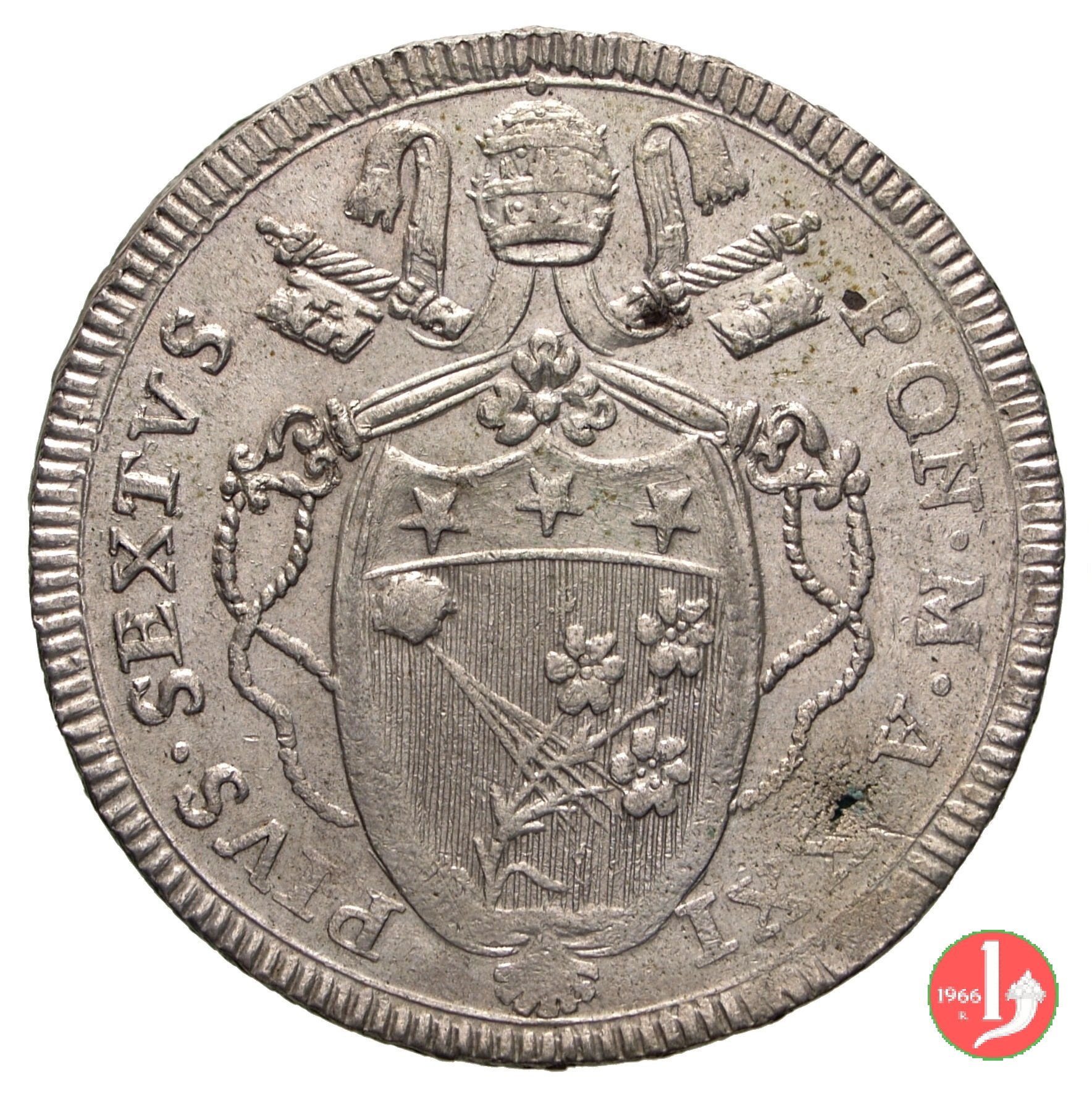 60 baiocchi Dritto: Stemma. Chiavi. Inizio della leggenda da sinistra in basso. PIVS SEXTVS - PONT MAXIMVS ANNO anno pontificato Verso: || BAIOCCHI || SESSANTA || millesimo - stellette disposte ad arco. | |