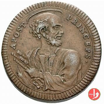 mezza doppia romana Dritto: Pianta di giglio. Inizio delle leggenda da sinistra in basso. FLORET • IN • DOMO - • DOMINI * - Esergo: millesimo. Verso: San Pietro seduto su nubi. Inizio della leggenda da sinistra in basso. APOSTOLOR • - PRINCEPS - Eergo: • P •-15 ai lati di armetta prelatizia con cappello. | |