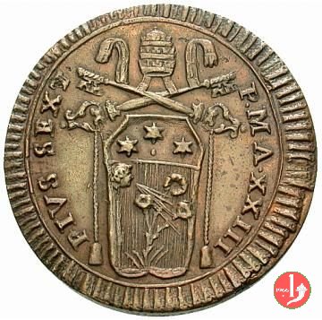 baiocco del 1° tipo (stemma ovale) Dritto: Stemma ovale in cornice, conchiglia in basso. Chiavi con doppi cordoni, sormontate da tiara. Inizio della legenda da sinistra in basso: PIVS • SEXTVS - PON • M • A • (anno pontificato) Verso: VN || BAIOCCO || ROMANO in corona di foglie d'alloro grandi, con bacche chiusa in alto da conchiglia. | |
