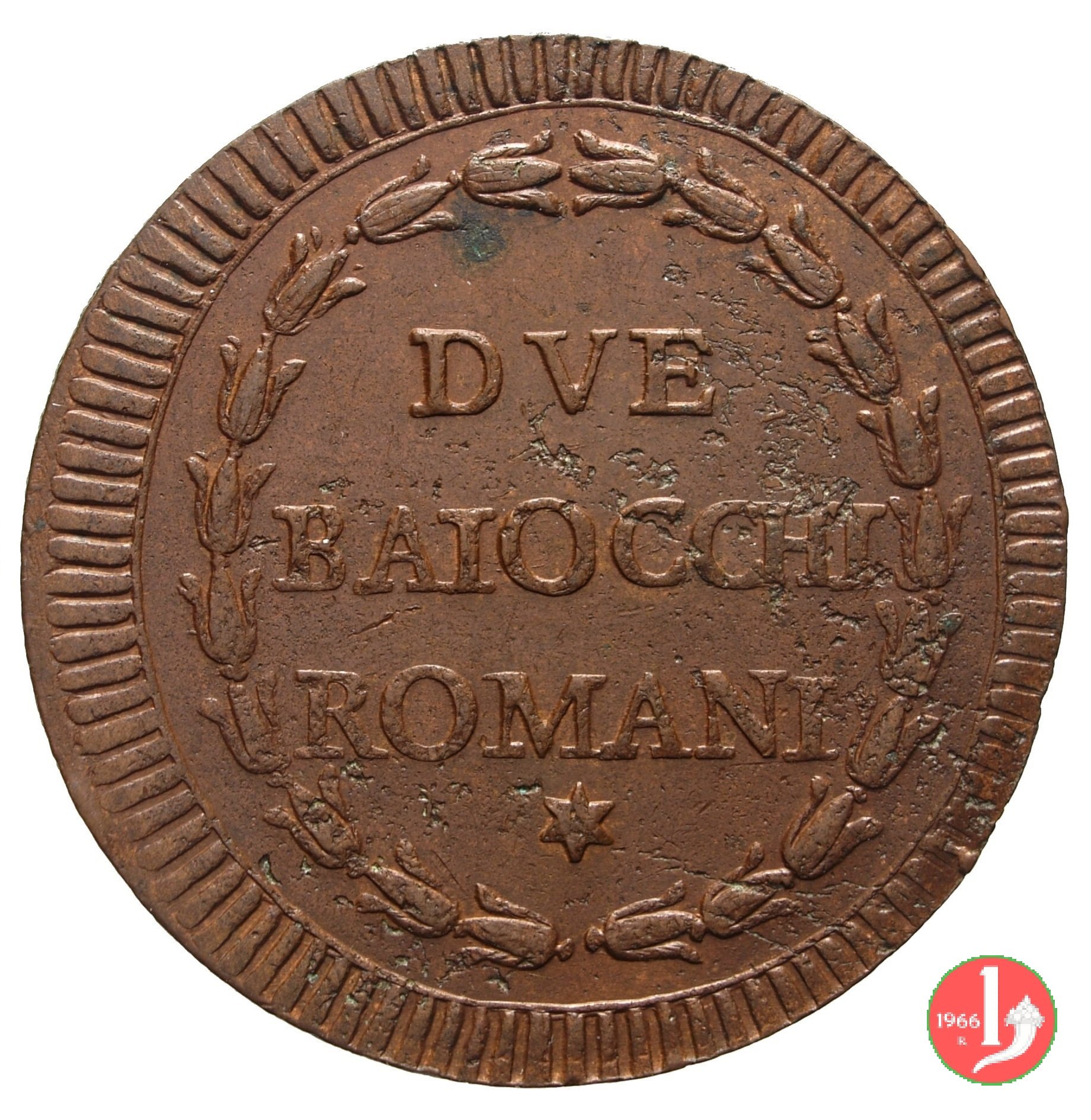 2 baiocchi del 1° tipo (A. XI - A. XXI) Dritto: Stemma ovale in cornice, chiavi con dopppi cordoni; inizio della leggenda da sinistra in basso: PIUS SEXTUS - PON • M • A • (anno di pontificato) Verso: DVE || BAIOCCHI || ROMANI || * in corona di fiordalisi. | |