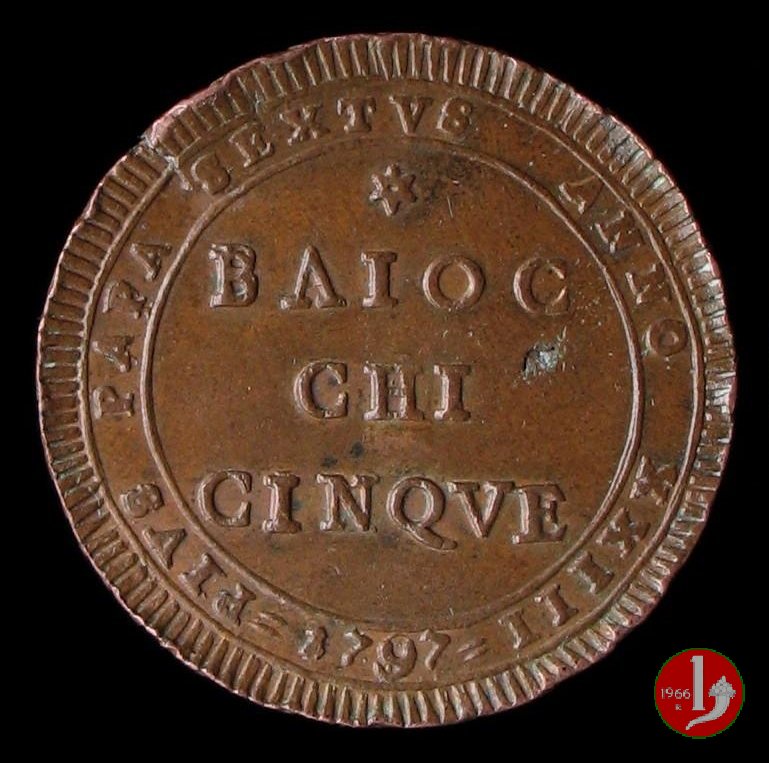 madonnina Dritto: * || BAIOC || CHI || CINQVE in cerchio lineare. Inizio della leggenda da sinistra in basso. PIVS PAPA SEXTVS ANNO XXIII ; in basso: = 1797 = Verso: Busto della madonna a sinistra. inizio della leggenda da sinistra in basso. SANCTA DEI - GENITRIX ; in basso: T • M | |