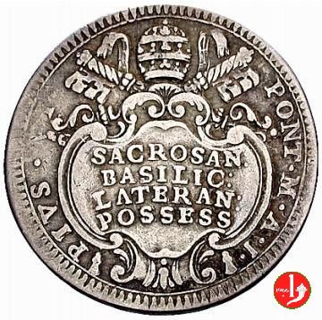 doppio giulio del I tipo (del possesso) Dritto: SACROSAN: || BASILIC: || LATERAN: || POSSESS in cartella ovale sormontata da chiavi decussate e tiara. (s) PIVS VI - PONT M A I (s) AVXILIVM DE - SA - NCTO - 1775 | |